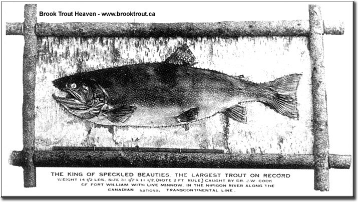 Many people do not believe it's possible for a Brook Trout to get that big. Some were saying it was a Splake, which is a cross between a Brook Trout and a Lake Trout. The Royal Ontario Museum of Zoology in Toronto did examine the fish and certified it to be a genuine pure bred Brook Trout. I myself had a hard time believing it until I found out they are pulling 9 and 10 pound Brookies out of lakes in the Nipigon and Wawa area, and in present times, so an extra 4 pounds in 1915 is not a big stretch. Plus in 1915 there was next to no pollution or fishing pressure.